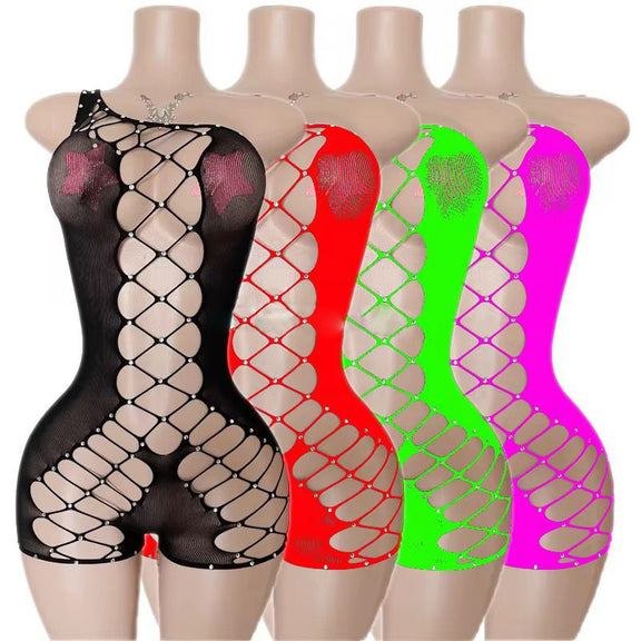 Enterizo de malla con diseño asimétrico y cortes abiertos que realzan la silueta.