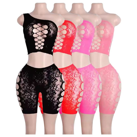Este set de dos piezas presenta un top de un solo hombro combinado con un short de encaje y transparencias que realzan la figura con elegancia y actitud. Su diseño equilibra sensualidad y estilo, convirtiéndolo en una opción ideal para dancewear, contenido visual o looks statement que no pasan desapercibidos.
