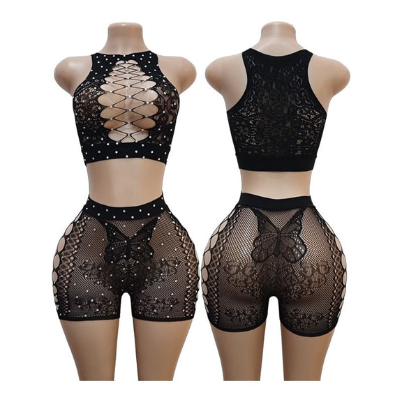 Este set de dos piezas combina encaje floral y malla translúcida con detalles cruzados que aportan carácter, sensualidad y un ajuste visualmente impactante. Diseñado para realzar la silueta, el top con diseño frontal entrecruzado crea un efecto llamativo, mientras que el short de tiro alto estiliza y define las curvas con comodidad.